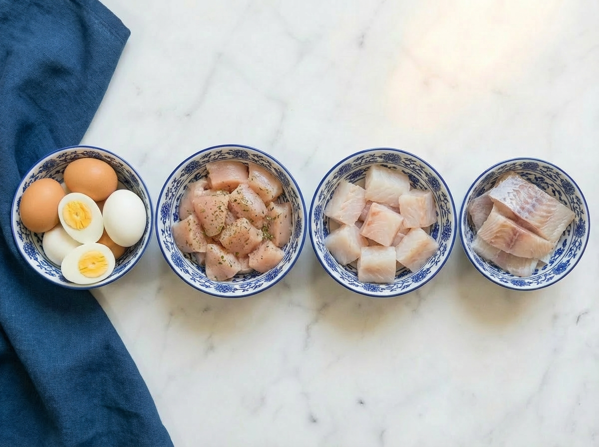[IMAGE PLACEHOLDER 1: Flatlay of eggs, chicken cuts, fish fillet]